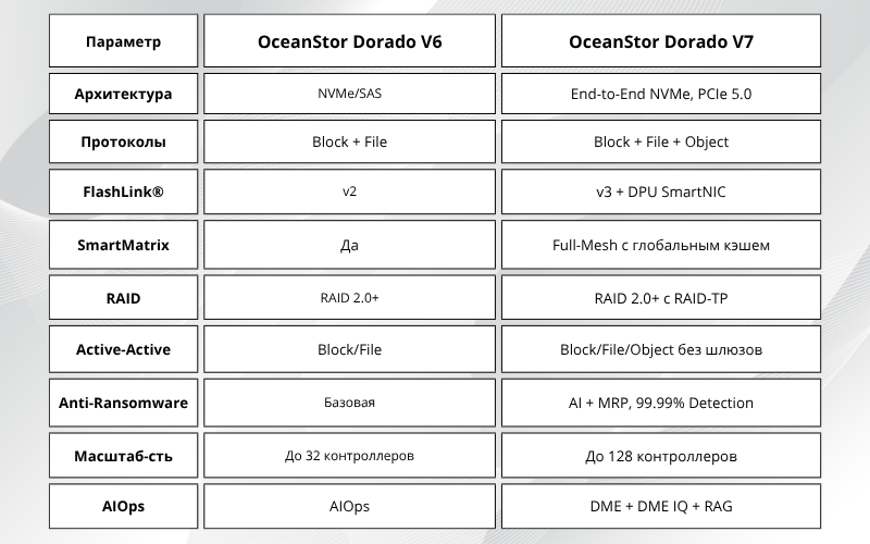 Huawei анонсировала линейку OceanStor Dorado V7 — полностью флеш-системы хранения нового поколения: 3000, 5000, 6000, 8000 и 18000. Серия создавалась для нагрузок эпохи ИИ и объединяет блочные, файловые и объектные сервисы в одной платформе, обеспечивая производительность до 100 млн IOPS при ультранизкой задержке 0,03 мс.